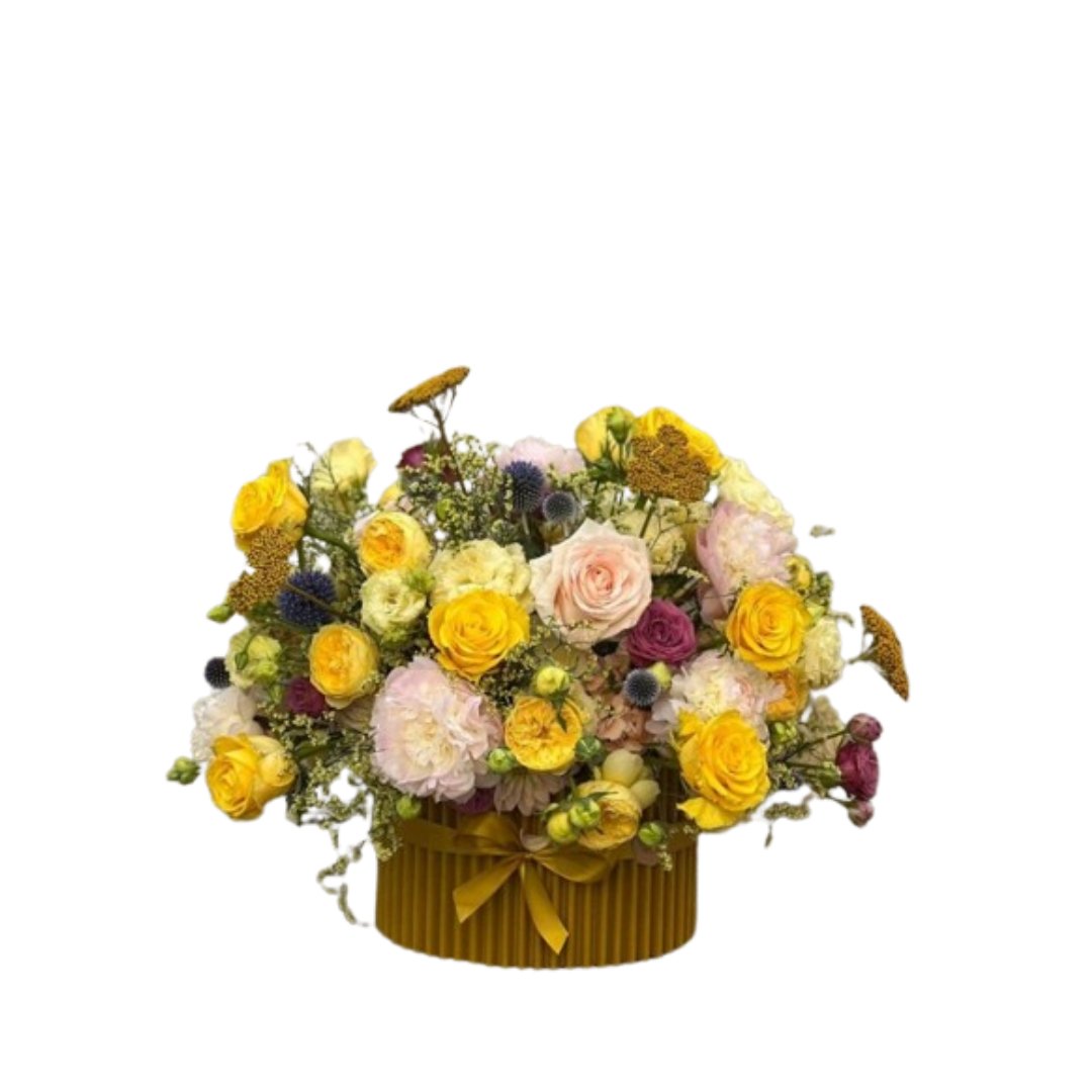 Una solare box floreale di forma ovale composta da Rose, Peonie, Ortensie, Eringium, Roselline a grappolo, Limonium e Dalie.