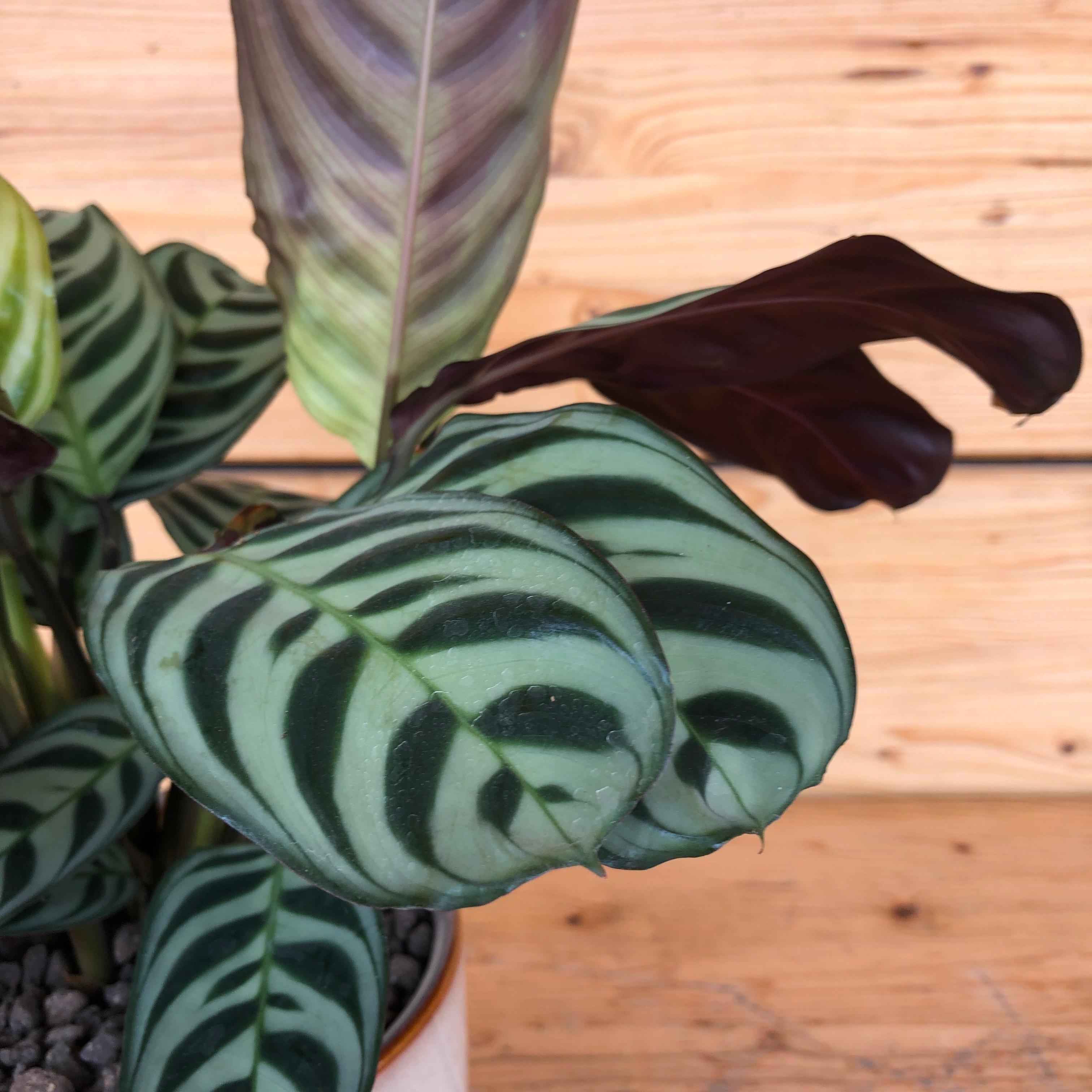 La Calatea, conosciuta per le sue foglie dalla straordinaria tessitura e dai colori vibranti, ora trova la sua dimora perfetta in un vaso di ceramica lucida, pronto per illuminare ogni ambiente.