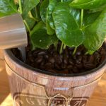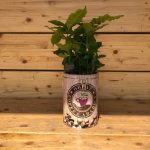 Uno sfizioso barattolo in latta al cui interno è posizionata una profumata pianta da caffe con i suoi chicchi.