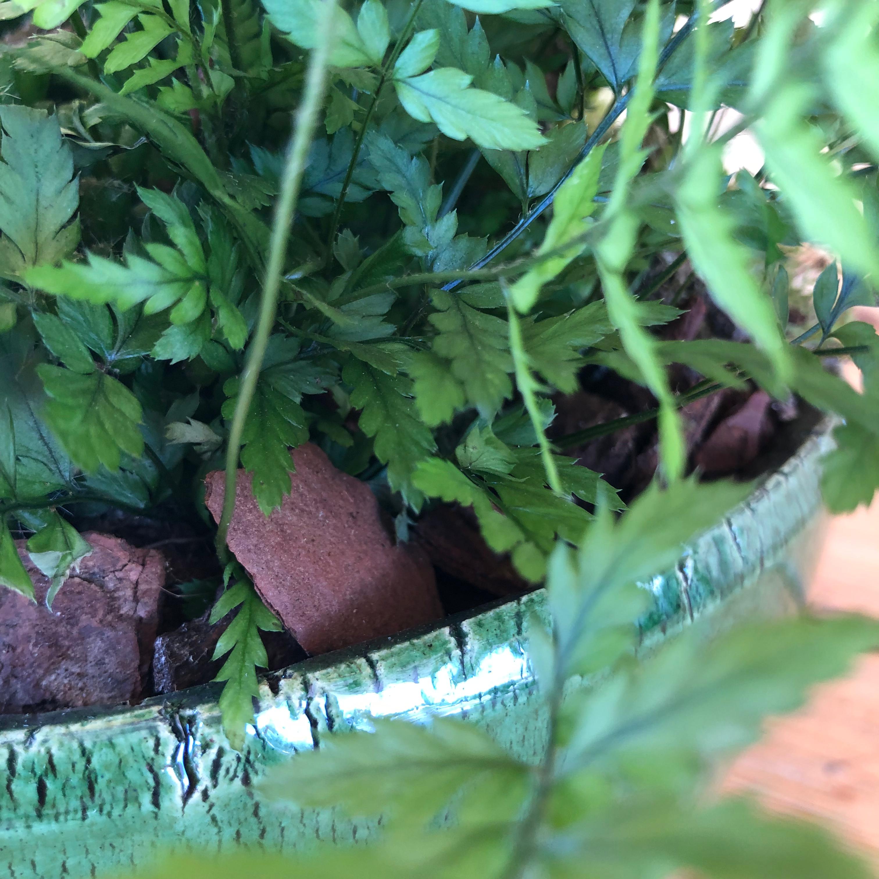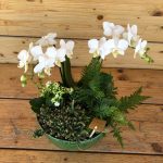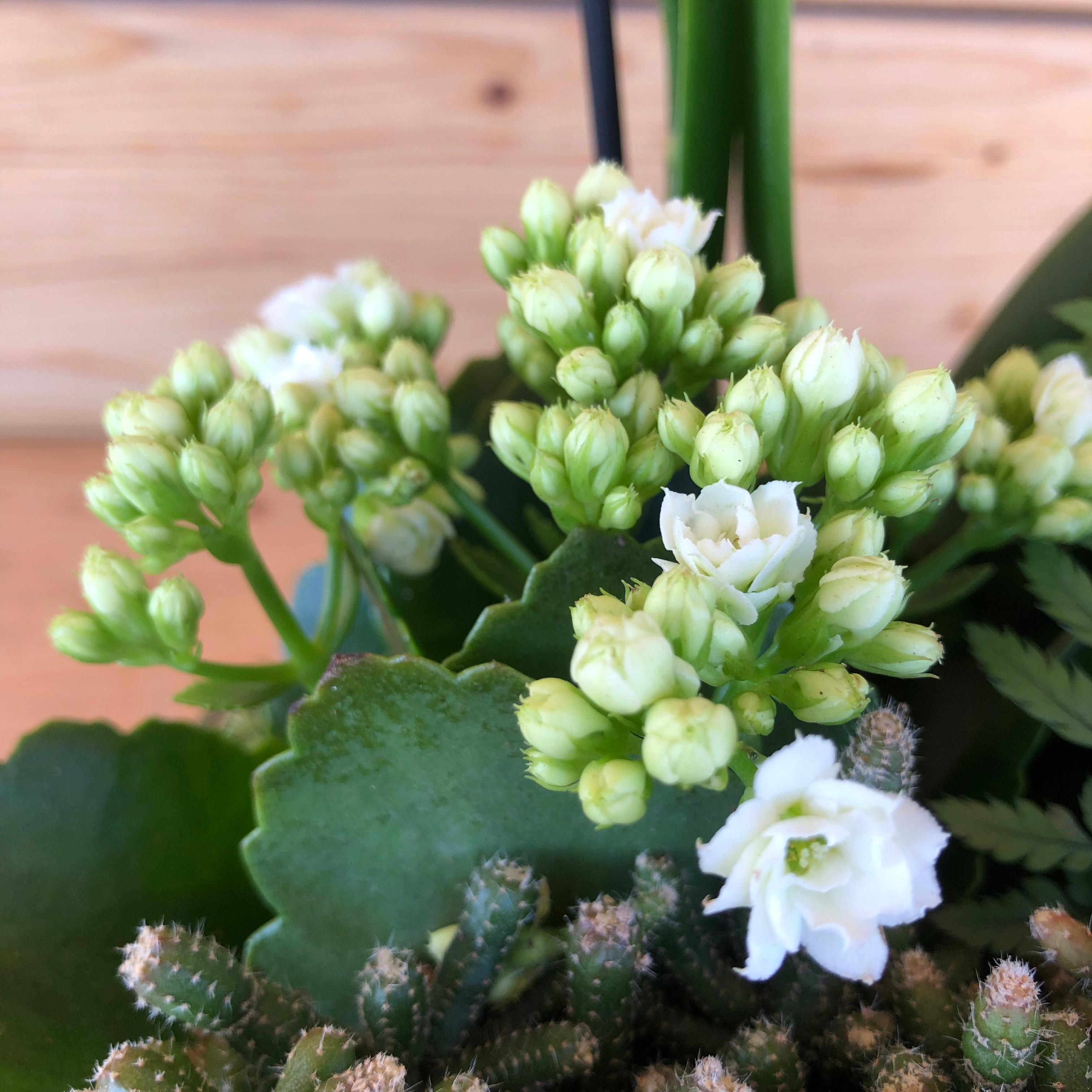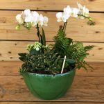 Un vaso green lucido al cui interno troverete una composizione di piante grasse come la rhipsalis e la kalanchoe con una meravigliosa phaelanopsis