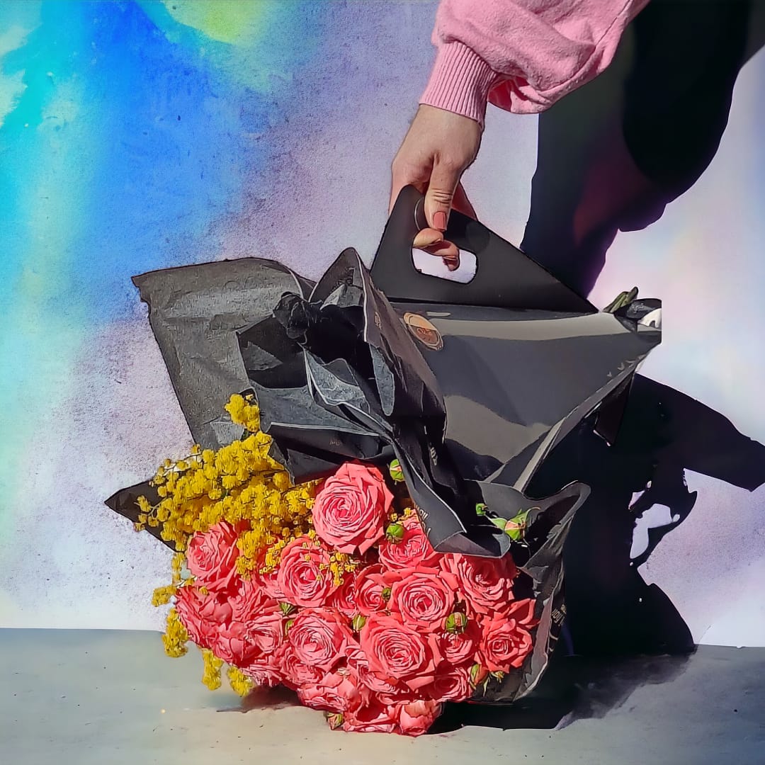 Vi proponiamo questa borsa , una creazione originale e innovativa che combina il fascino di un cono floreale con la funzionalità di una borsa a mano. Il cono è realizzato in carta nera rigida plastificata che richiama l’eleganza del marchio l’asso dei fiori!