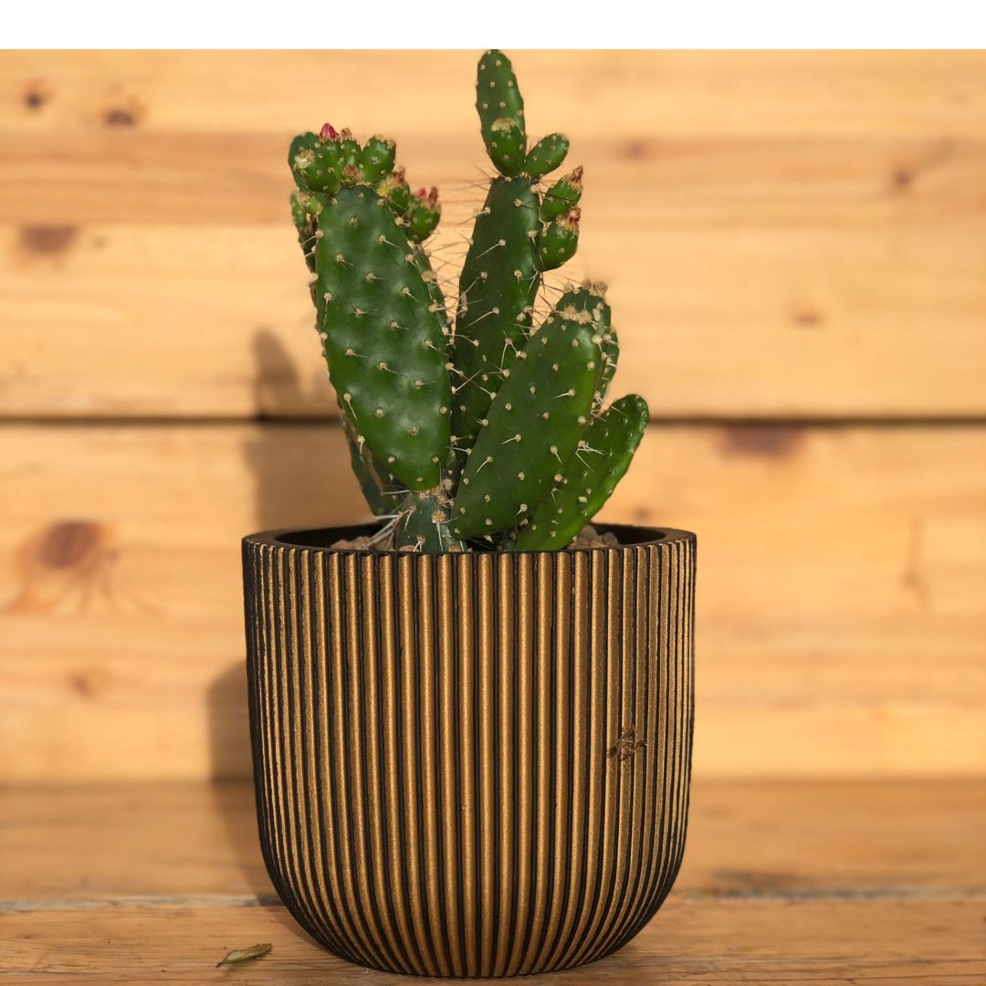 Il fico d’India, con le sue caratteristiche foglie verdi e i frutti succulenti, è una pianta che aggiunge un tocco esotico e vivace a qualsiasi ambiente. In questo vaso moderno e raffinato, dal design elegante e dai dettagli dorati a righini, il fico d’india trova la sua perfetta cornice. Un connubio di stile e natura, pronto a decorare con classe e originalità qualsiasi spazio della tua casa. Aggiungi un tocco di glamour e freschezza al tuo arredamento con questa splendida composizione.