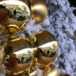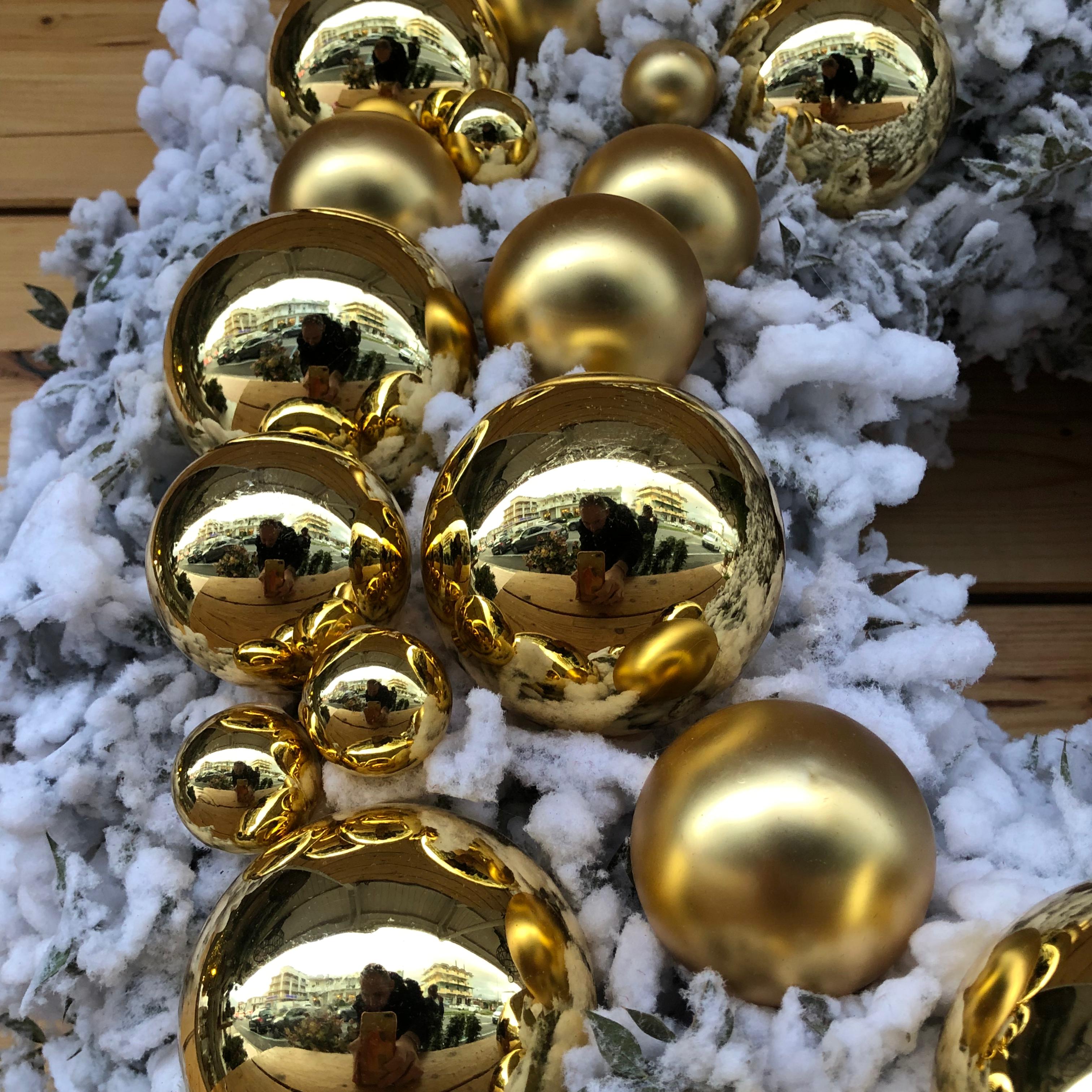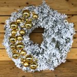Eleganza Natalizia: Ghirlanda Fuoriporta di Pungitopo Bianco e Palle in Vetro Oro