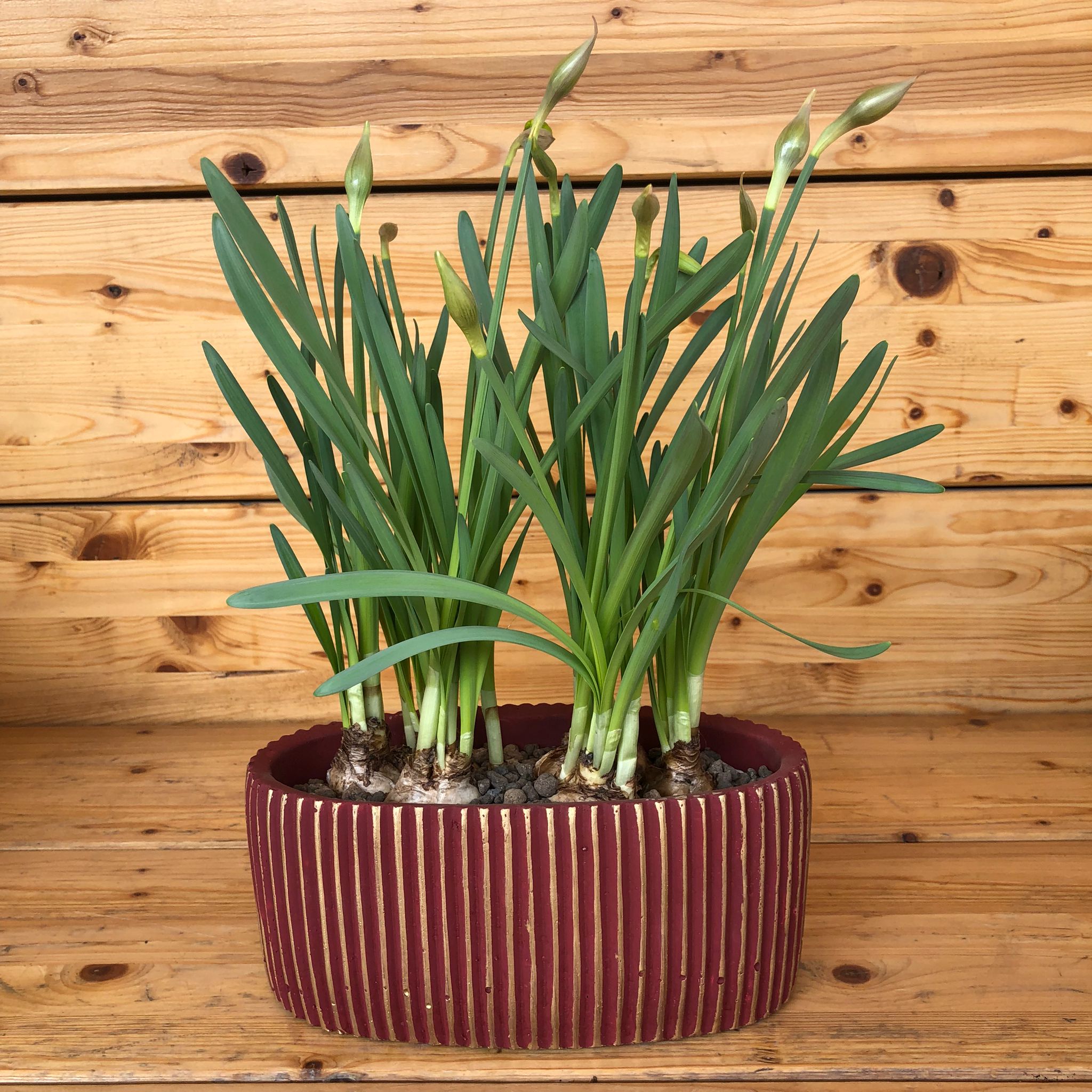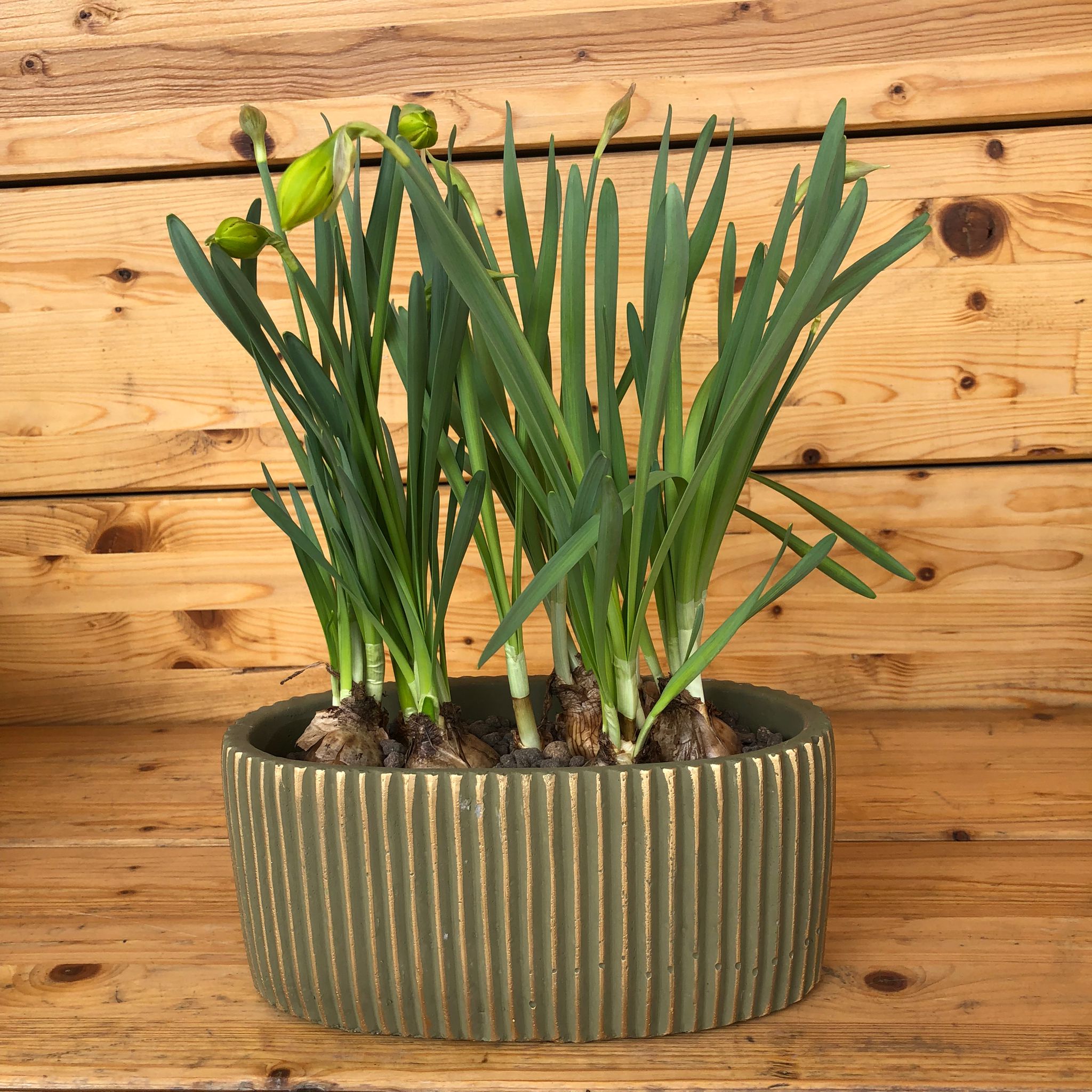 Il Narciso o Narcissus è una pianta bulbosa , priva di fusto che può raggiungere un’altezza massima di 40 centimetri e che presenta un bulbo di grandi dimensioni, sporgente dal terreno, da cui si sviluppano le foglie erette, coriacee e nastriformi di generose dimensioni e di colore verde scuro. La fioritura avviene alla fine dell’inverno quando dallo stelo centrale della pianta sboccia un fiore a forma di tromba, formato da morbidi petali di colore giallo disposti attorno ad una corona centrale di tonalità gialla o arancione: il fiore emana un intenso e penetrante profumo da cui appunto deriva il nome Narciso che tradotto dal greco significa stordente. Vi proponiamo un vaso ovale in due varianti di colore con i bellissimi narcisi