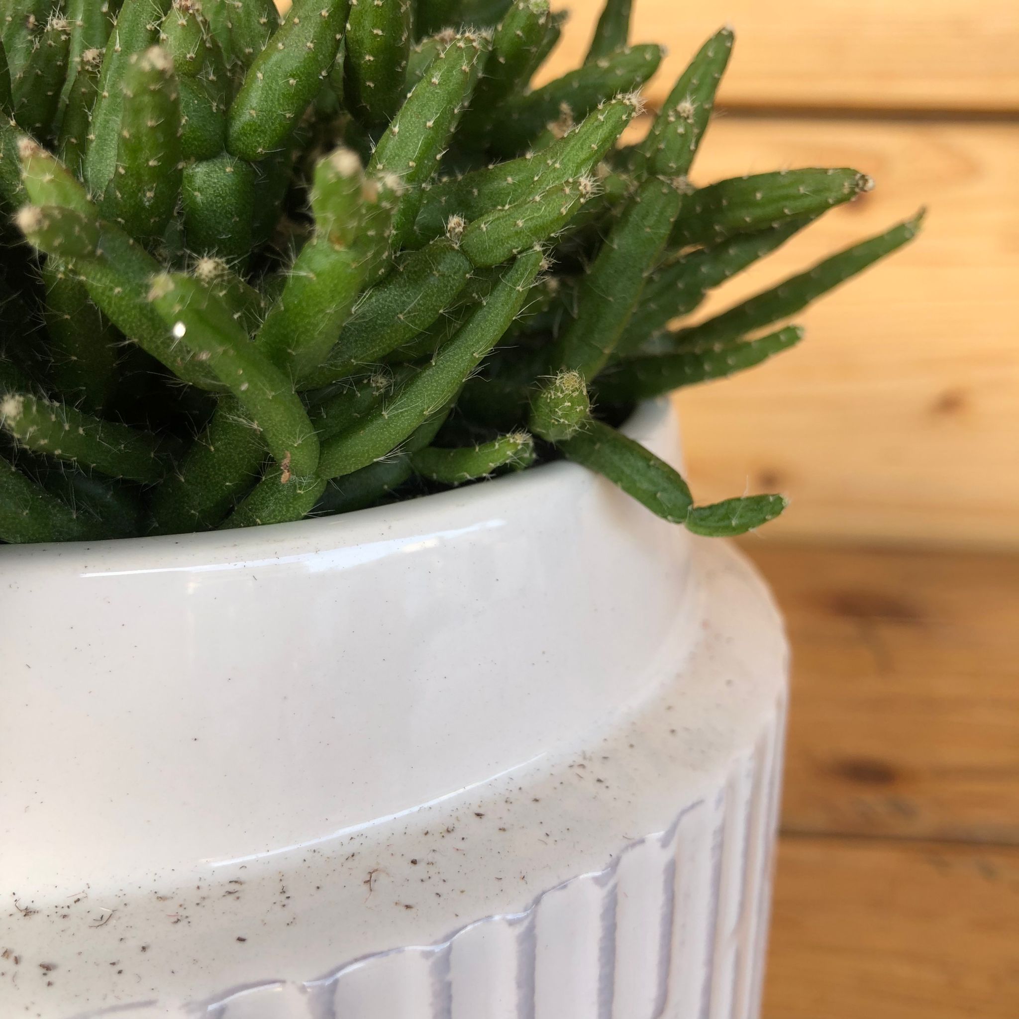 Questa bella rhipsalide è una pianta resistente e facile da curare, perfetta per abbellire qualsiasi ambiente. Il vaso basso bianco lucido le rende una scelta elegante e moderna per la tua casa o ufficio. Combina bellezza e facilità di mantenimento con questa rhipsalide in vaso basso.