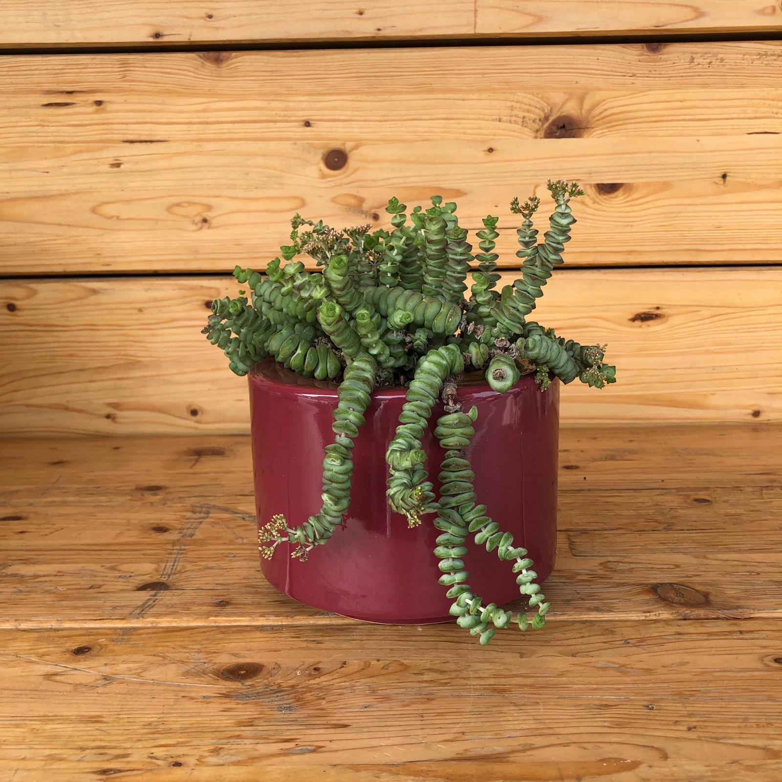 Una pianta grassa che da l’impressione di tanti ricciolini in un vaso lucido