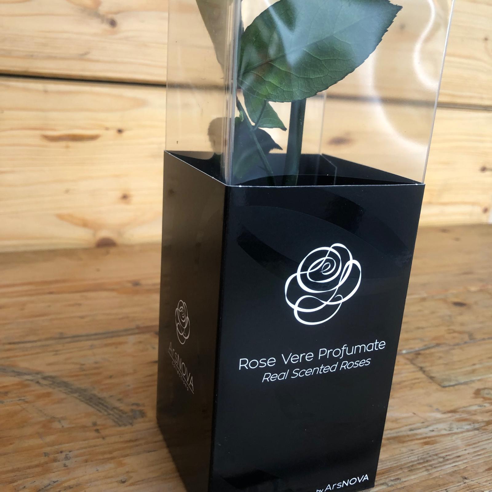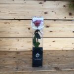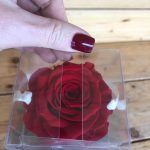 Una bellissima rosa rossa stabilizzata in una comoda ed elegante confezione.