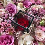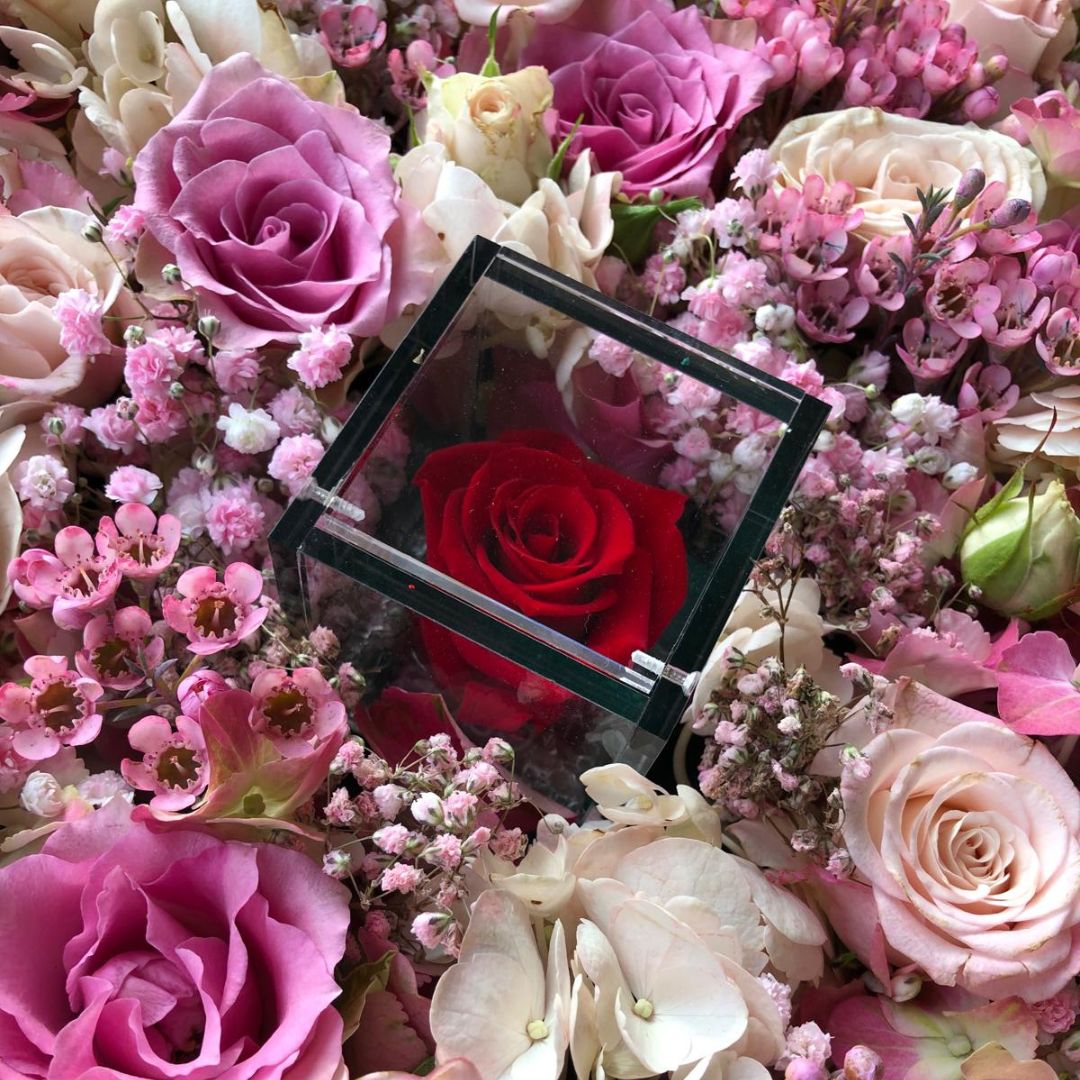 In un giorno speciale come San Valentino stupisci la tua lei con un gesto d’amore e autentico con questa meravigliosa scatola in velluto rosso al cui interno troverete un tappeto di fiori freschi dai colori delicati al cui centro ci sarà il richiamo eterno del vostro amore con una splendida e immutabile rosa stabilizzata.
