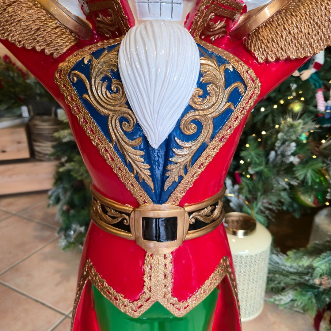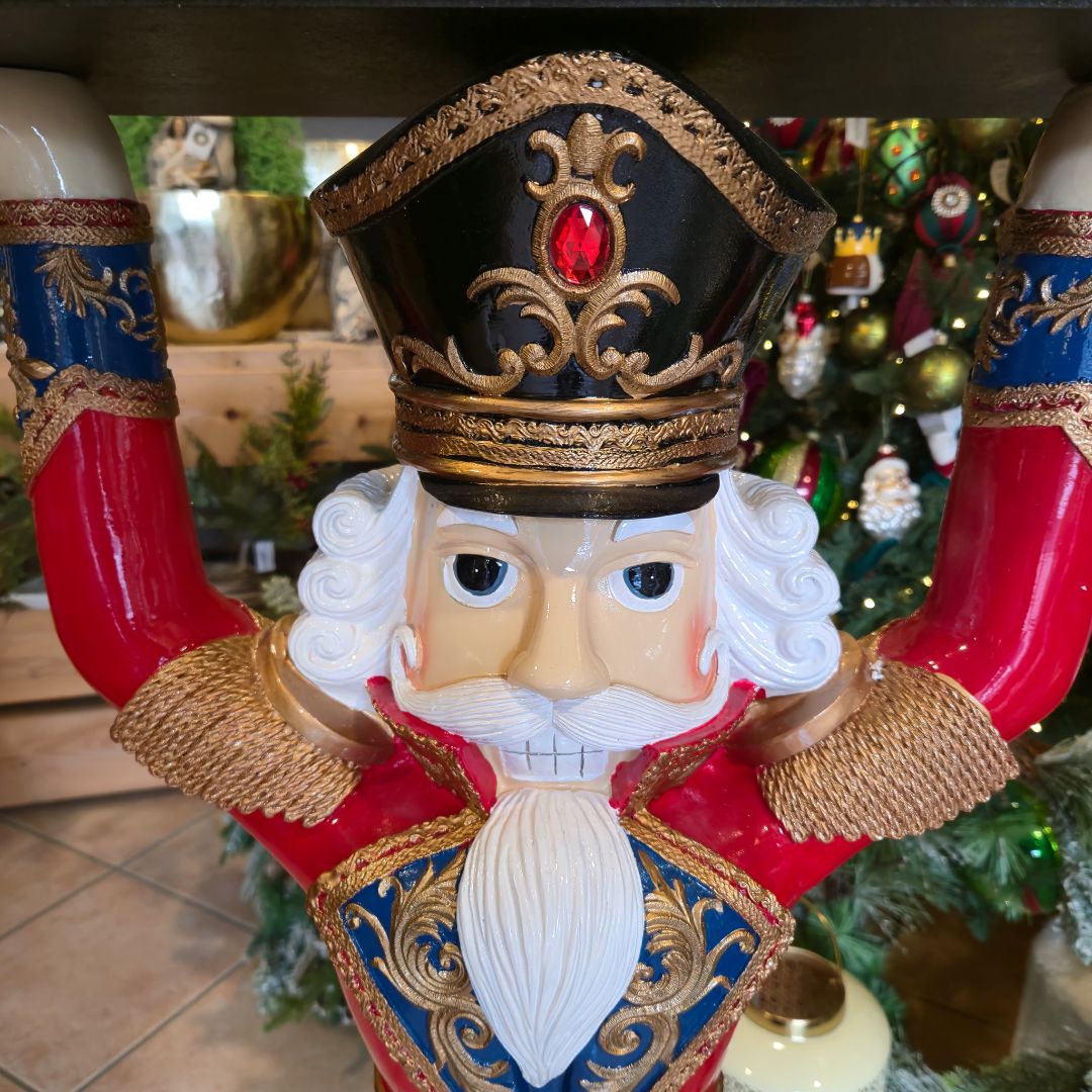 Porta un tocco di grandiosità e funzionalità alle tue decorazioni natalizie con il nostro magnifico schiaccianoci, alto ben 105 cm. Questo straordinario schiaccianoci si distingue per la posizione imponente in cui tiene un vassoio sopra la testa con le mani tese, pronto a sostenere qualsiasi oggetto desideri esporre.