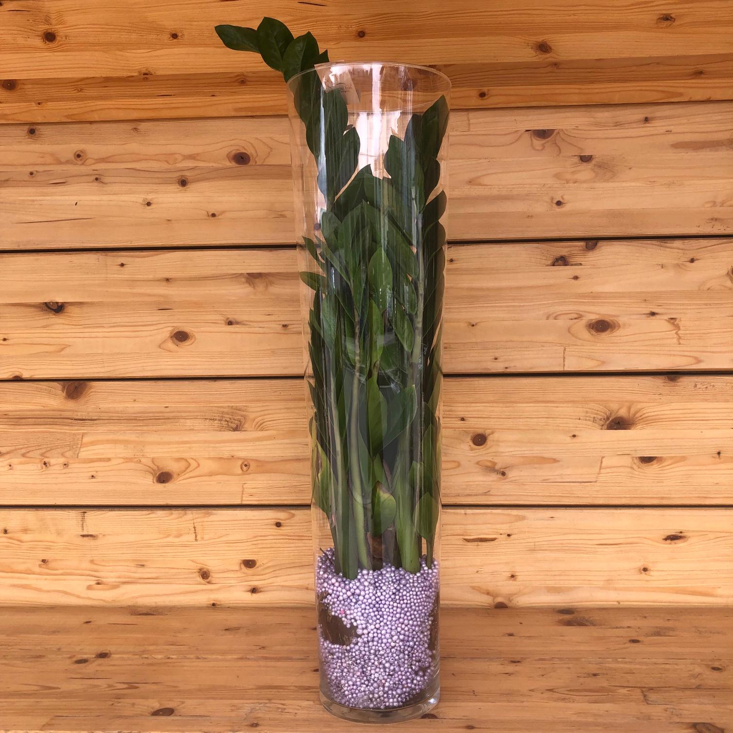 Una zamia in un vaso alto cilindrico con elementi decorativi .